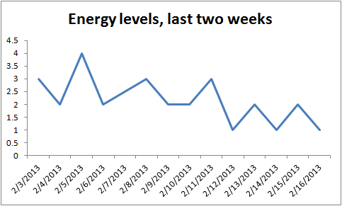 I then started playing with what I came to call the “shittiness index” which was a combination of my fatigue, muscle discomfort and pain. It went over really well with my loving blog followers.