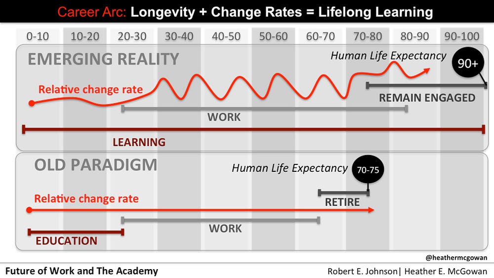 We need more courage from our leaders to stop being so modish, but we also need a mindset shift in the workforce. We cannot expect our learning to come from organizations. Expecting our education from the first 22 years of our life to enable us to succeed at age 40 is absurd. Similarly, expecting the organization you work for to perfectly prepare you for the future is almost just as crazy. Heather McGowan created a killer PowerPoint graphic (jealous of her skills!) to bring this to life in her incredible article “Preparing Students to Lose Their Jobs”: