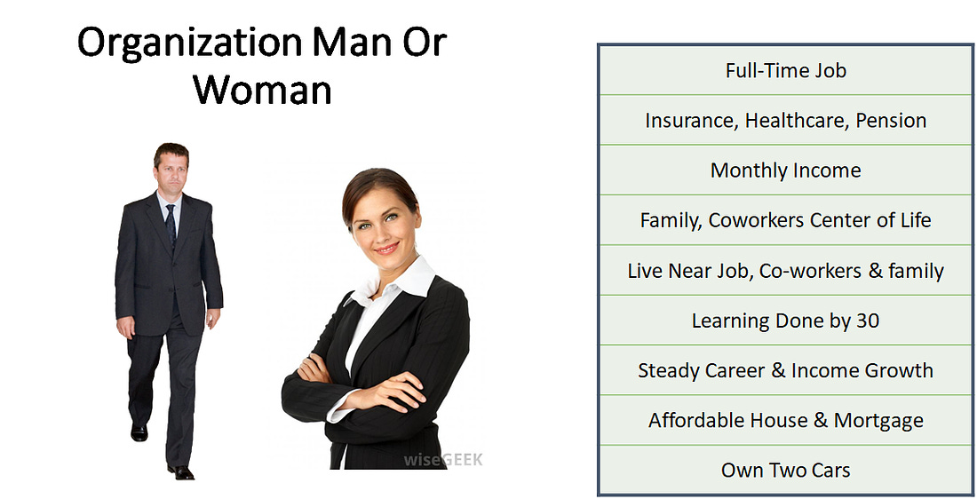 Less than a third of people work in full-time jobs. Even less have jobs with great healthcare, benefits and a path for personal and income growth. Yet our assumptions about the working world are based on a myth of the “organization man” from the 1950s: