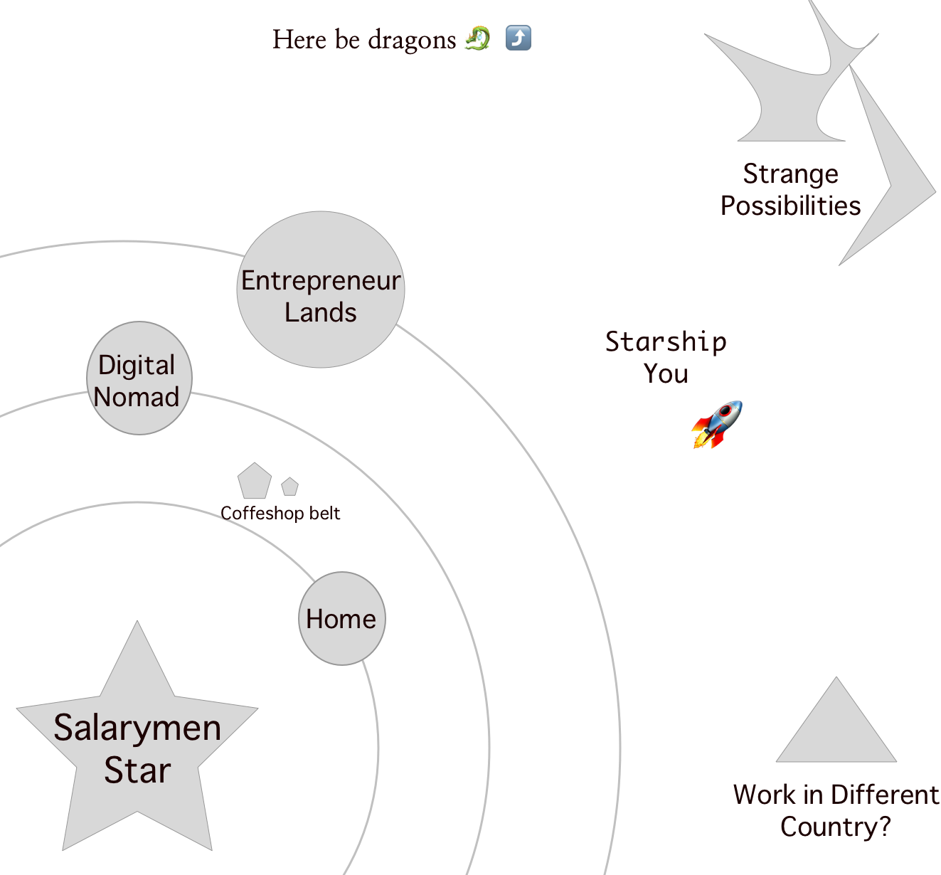 It’s like “Salaryman Lite”, “Worker-From-Home”, “Digital Nomad” and “Entrepreneur“ have a certain mass. The more you identify as X, the more gravity it produces. The more gravity it produces, the more effort it is to escape the identities’ pull.