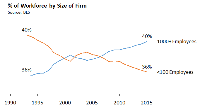 - Dis-aggregation — Paul Graham had an excellent essay on what he called “the refragmentation” (see here). A key insight was that organizations are setup to minimize transaction costs (coase theory). Technology has dramatically reduced the cost of doing business across many industries. While still substantial, scale advantages will continue to diminish.
